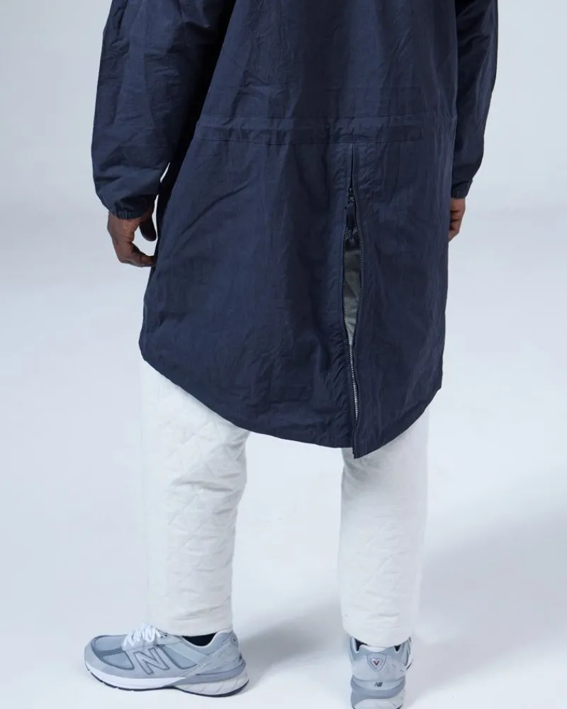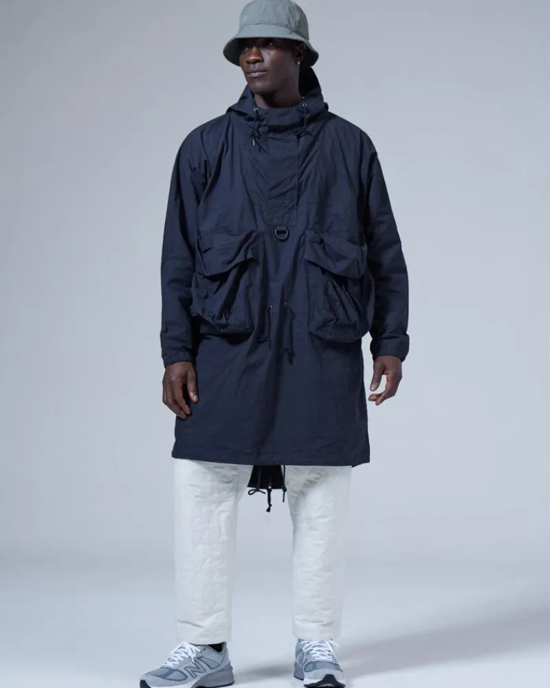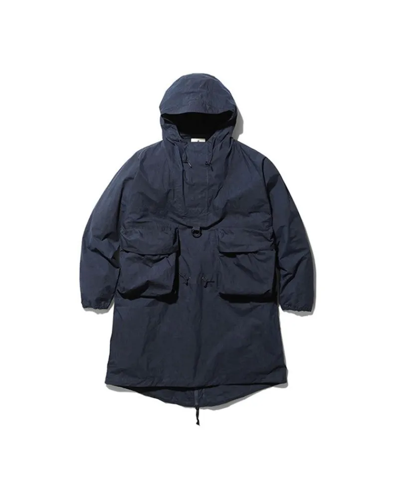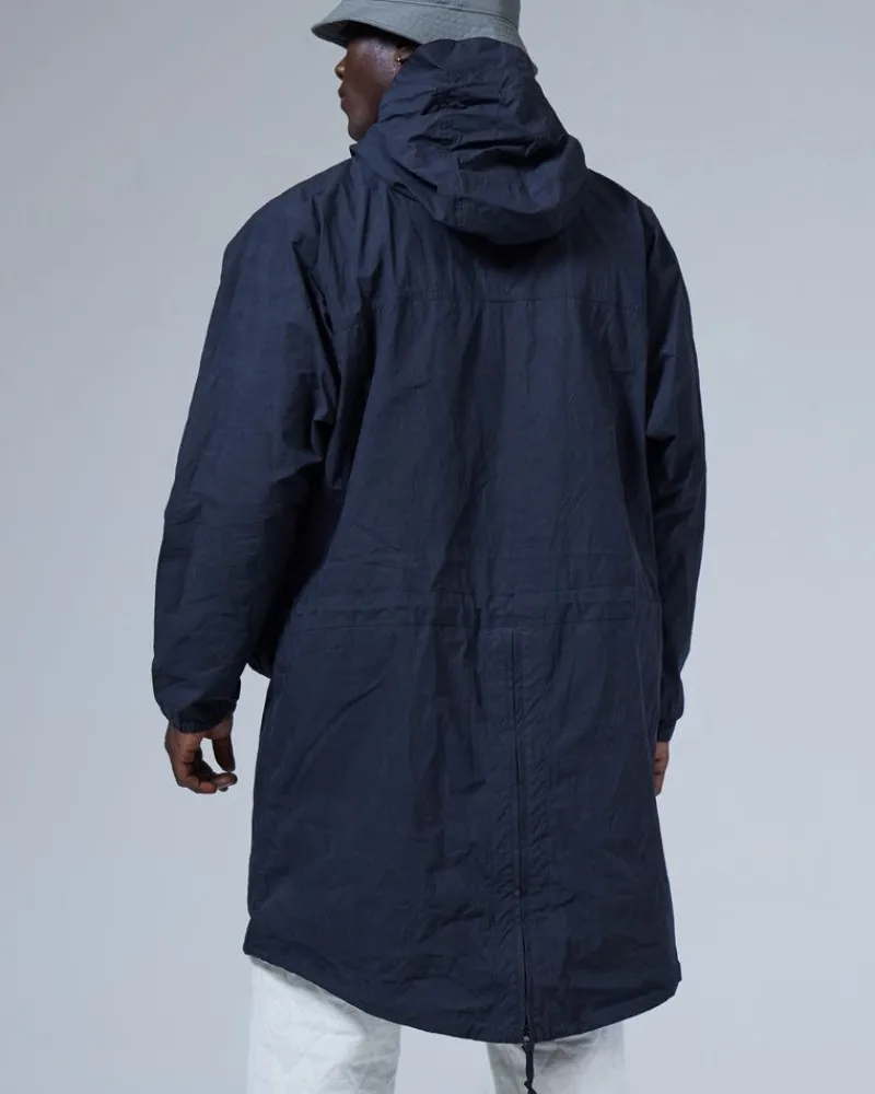 The Indigo C/N Anorak Is A Lightweight Overcoat. The Fabric Is A Cotton And Nylon Blend. The Indigo C/N Anorak Features A Hood With A Drawcord, Half-Zip Closure, A D Ring, Two Bust Pockets, And A Fishtail Hem.