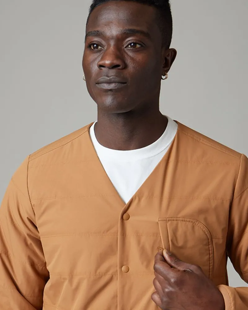 The Flexible Insulated Cardigan Is A Lightweight, Collarless Jacket. The Cardigan Is Made Of Recycled Polyester And Primeflex Material With A Durable Stretch And A Water-Repellent Finish. The Flexible Insulated Cardigan Features A V-Neck Opening, Snap Button Closures, A Left Chest Pocket, And Dual Pockets At The Waist