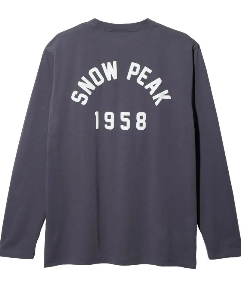 The Snow Peak Foam Printed Long Sleeve T-Shirt Is An Upcycled T-Shirt. The Shirt Is Made Of Recycled Polyester And Organic Cotton. The Shirt Features A Crew Neck, Long Sleeves, Snow Peak Graphic On The Chest And Back, And A Straight Hem.