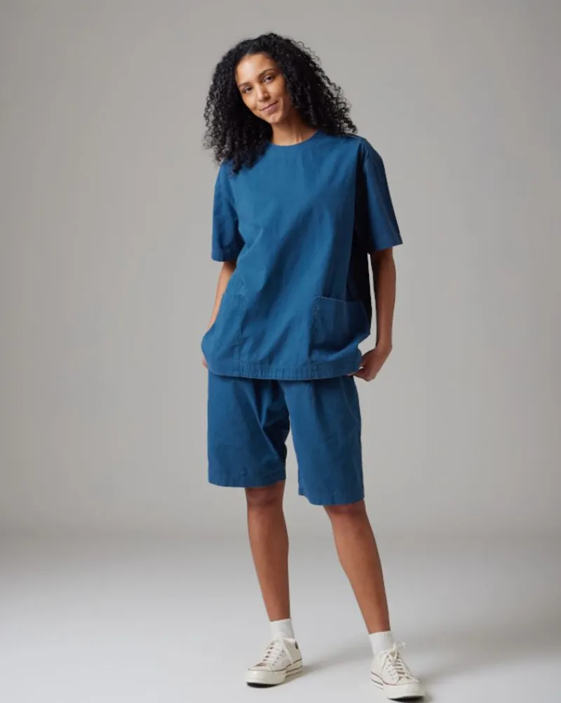The Natural-Dyed Recycled Cotton Shorts Are Relaxed Cargo Shorts. The Fabric Is Lightweight Recycled Cotton And Dyed With Eco-Friendly Natural Dye. The Natural-Dyed Recycled Cotton Shorts Feature An Elastic Waist With Button Closure And Drawcord, Dual Side Pockets, And A Straight Hem.