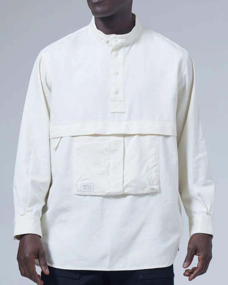 Takibi Light Denim Utility Pullover Is A Fire-Resistant Casual Shirt. The Pullover Has Warp And Weft Threads Made Of Cotton, Flame-Retardant Acrylic Kanekalon, And Nep Cotton. In Addition, The Takibi Light Denim Utility Pullover Features A Stand Collar, Henley Buttons, A Front Pocket Pouch, Two Side Pockets, And A Curved Hem.