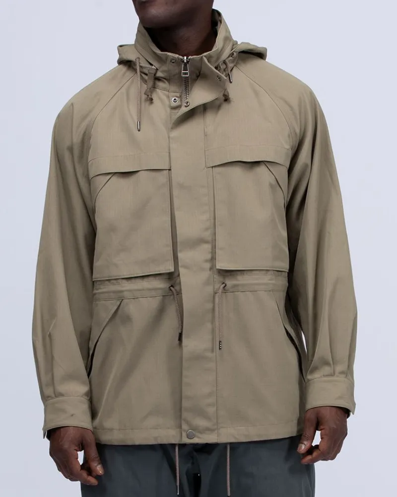 The Takibi Mountain Jacket Is A Water-Resistant Canvas Jacket. The Jacket Is Made Of Fire-Resistant Fabric, Aramid, And Organic Cotton. It Features A Stand Collar With A Hidden Hood, Zip And Button Closure, Dual Bust Pockets, Waist Drawcord, And Dual Waist Pockets.