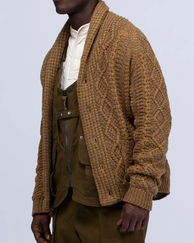 Alpaca Knit Cardigan Is A Shawl-Collared Chunky Knit Sweater. It Is Made Of A Blend Of Nylon, Wool, And Alpaca For A Warm, Voluminous Feel. The Alpaca Knit Cardigan Features A Shawl Collar, Button Closure, And Dual Front Pockets.